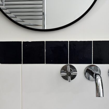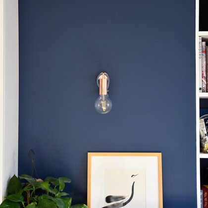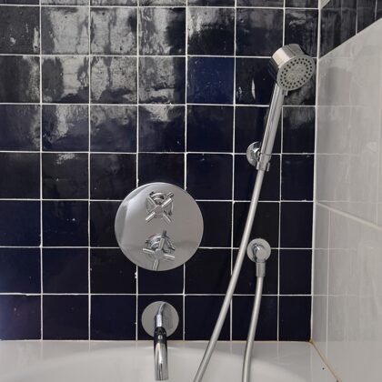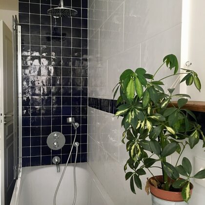 C’est l’histoire d’un pari : celui de vivre dans petit… mais joli! Les propriétaires, sous le charme d’un appartement à poutres apparentes et donnant sur un passage parisien typique, rénovent cet appartement au plan particulier : le séjour existant est diamétralement opposé à la salle à manger et une cuisine, aux cloisons en briques plaquées non porteuses, obstrue tout l’espace autour. Le projet consiste à retrouver un grand espace traversant comprenant en enfilade le séjour, une cuisine ouverte et la salle à manger. Ce volume orienté est-ouest donne une impression réelle d’espace dans le petit appartement. Deux chambres sont aménagées : une grande chambre pour les enfants sur cour et une chambre parents sur la rue. Le plan de la salle de bain est revu afin de permettre une ouverture naturelle. L’ensemble des fenêtres existantes est remplacé par des fenêtres bois traditionnelles à noix et gueule de loup et à haute performance isolante. Les poutres, massives en brun foncé, sont repeintes en gris clair. Bois et bleu inspirent la décoration : plan de travail en noyer, bibliothèque sur mesure avec panneaux coulissants en noyer. Une verrière est installée dans la chambre sur cour pour donner de la lumière à l’espace d’entrée.